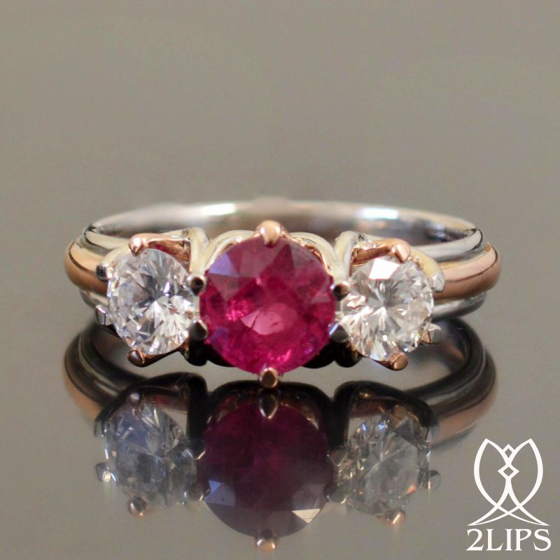 We are proud to introduce our 2LIPS trilogy ring made of 18K yellow pink and platinum, set with a ALGT certified natural Ruby weighing 1,38 ct. and 0.76 ct. HRD certified D colour VVS2 clarity diamonds.