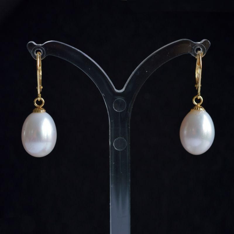 A set of white freshwater drop pearl pendant earrings. Provided with pearls of exceptional quality, derived from the Hyriopsis cumingii mussel. These beautiful pearls measure 11 x 11 x 14 mm. Over the past decade, due to its ability to produce high-quality pearls, this mussel has become the preferred mussel in pearl farming. Due to the high quality of these freshwater pearls, it has become increasingly difficult to distinguish them from saltwater pearls. The large white drop pearls are fitted with secure 18K yellow gold hinged leverbacks.